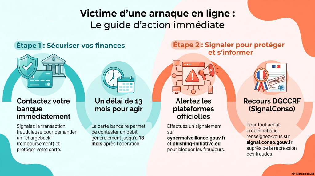 - Contactez immédiatement votre banque pour signaler une transaction frauduleuse et demander un chargeback (remboursement). La carte bancaire est l’un des moyens de paiement les mieux protégés en cas d’arnaque. Vous disposez généralement de 13 mois pour contester un débit.